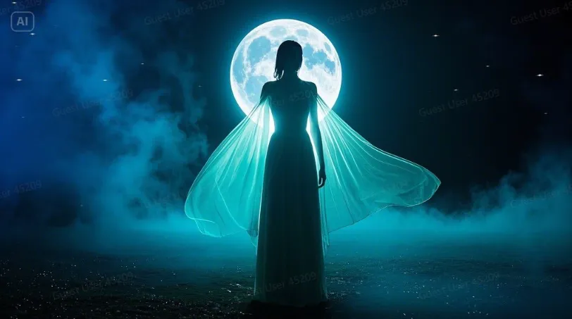 - Ethereal wraps floating above the body like fog, glowing softly in moonlight.
